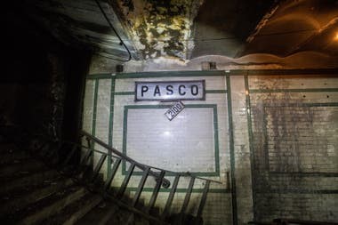Son las 12 de la noche. El servicio ya no corre. En la semioscuridad de la estación de la línea A abandonada se puede ver el cartel de "Pasco" y debajo, a punto de caerse, cuelga el cartel que indica la numeración de Rivadavia a esa altura: 2100. Los cerámicos blancos originales de las paredes, que están también en otras estaciones de la línea, se mantienen, aunque sucios, al igual que las guardas verdes que en otros tiempos se usaban para diferenciar a esta estación de las otras, que llevan otros colores.